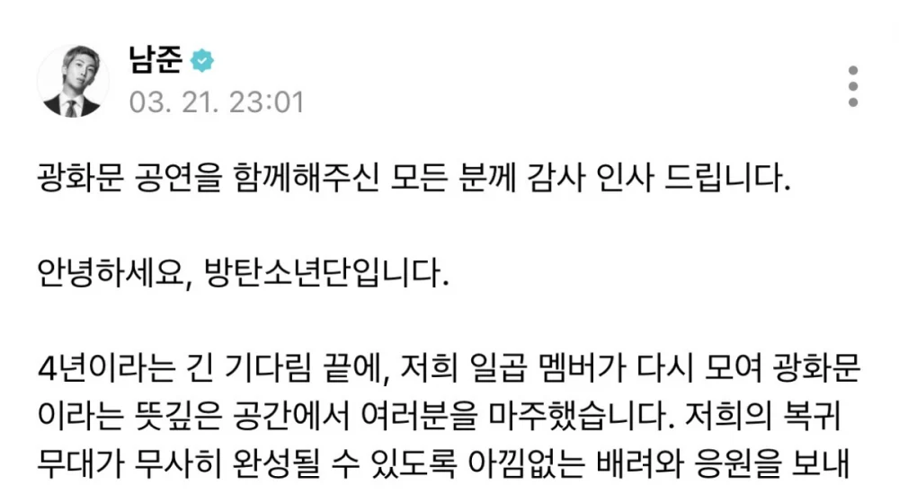 Pernyataan tersebut disampaikan sang idola saat menutup penampilan spektakuler mereka di jantung kota Seoul. RM menyampaikan pesan tersebut pada Sabtu (21/3/26).
